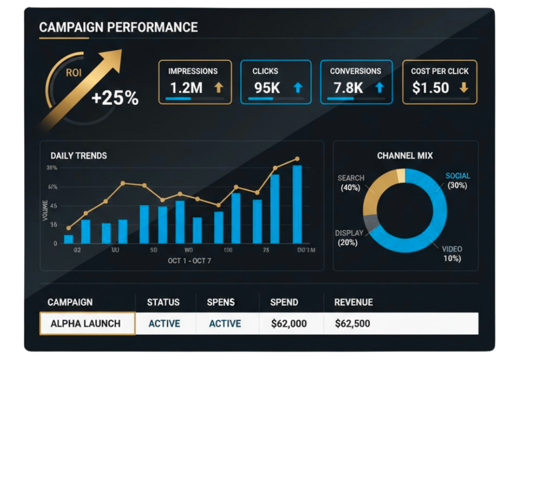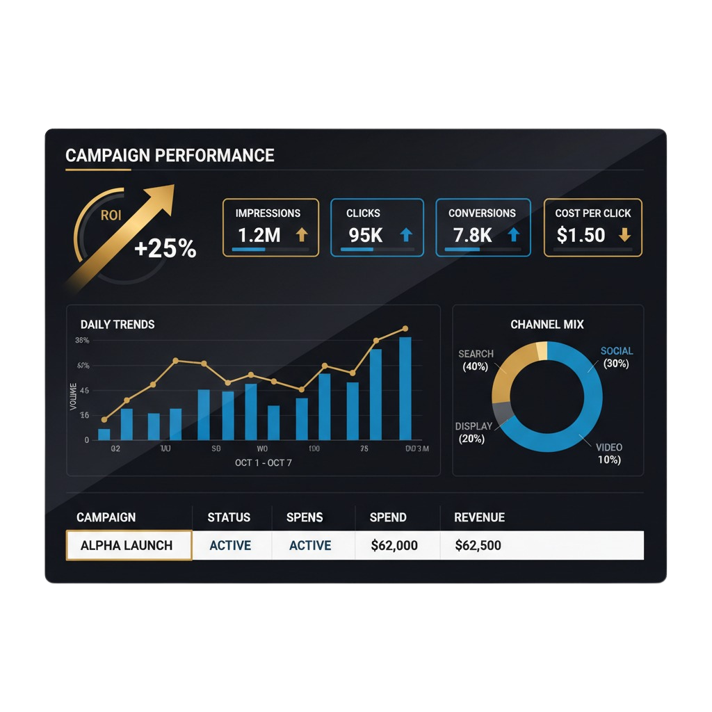 Suivi en temps réel de vos KPIs, optimisations continues, reporting transparent, avec résultats mesurables garantis sous 90 jours.