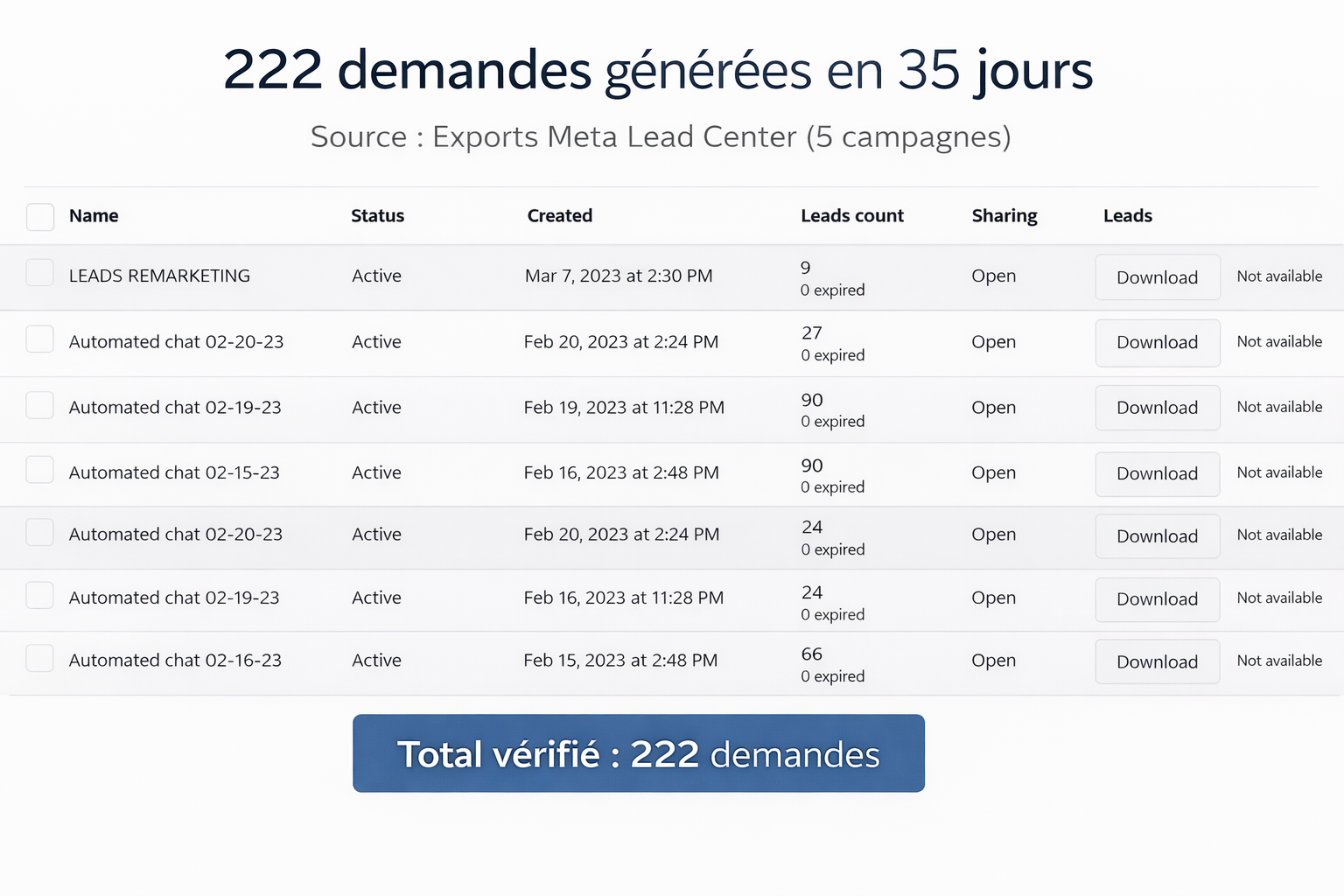222 demandes entrantes (Meta Lead Center — exports visibles)