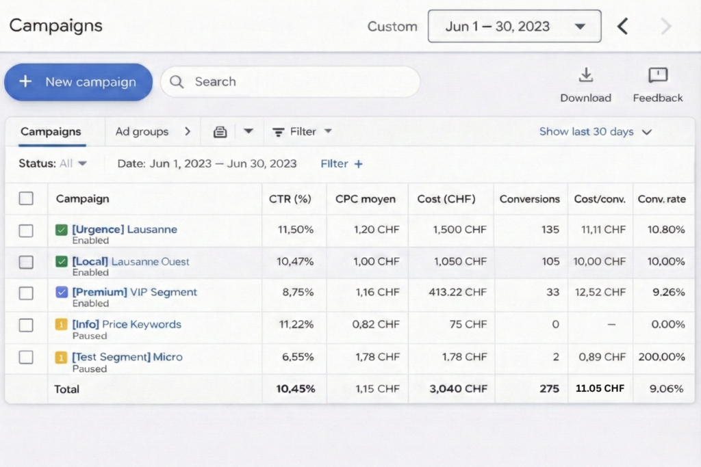 275 appels qualifiés en 30 jours. Budget total : 3’040 CHF. Coût par lead stabilisé à 11.05 CHF. CTR moyen 11.5% sur un marché où la norme est 3–4%. Taux de conversion global 9.06%. Canal Google Search devenu source principale d’acquisition dès le premier mois. Segments urgence et local responsables de 240+ appels à CPL maîtrisé.
