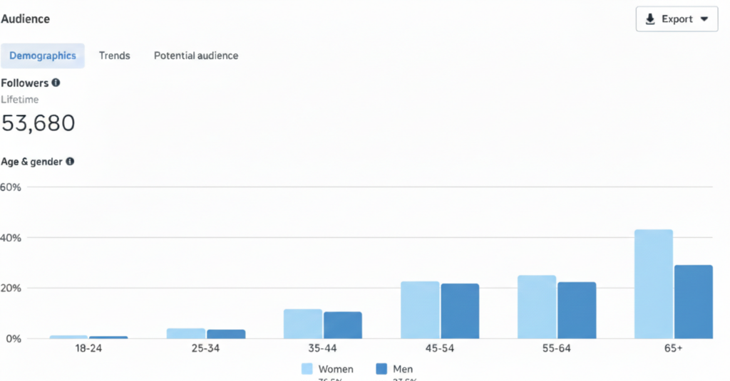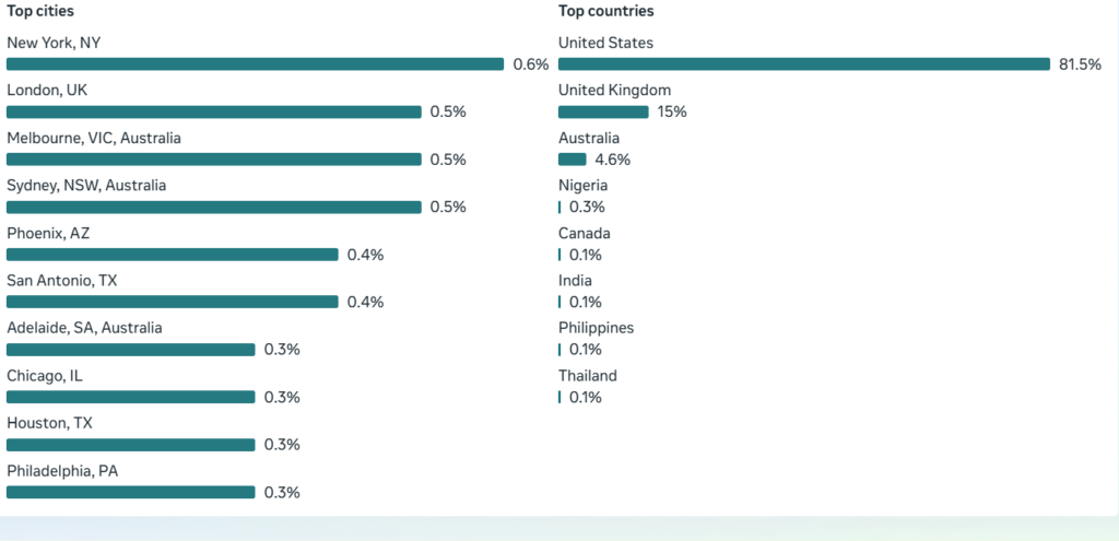 53’680 abonnés acquis en moins de 6 mois. Audience majoritairement basée aux États-Unis (81.5%), avec extension naturelle vers le Royaume-Uni et l’Australie. Présence dominante dans des zones clés comme New York, Phoenix et San Antonio. Profil démographique fortement concentré sur les segments 45+ et 65+, particulièrement performants en conversion dans l’univers pet-care. Transition validée vers une acquisition commerciale directe après atteinte d’une masse critique.