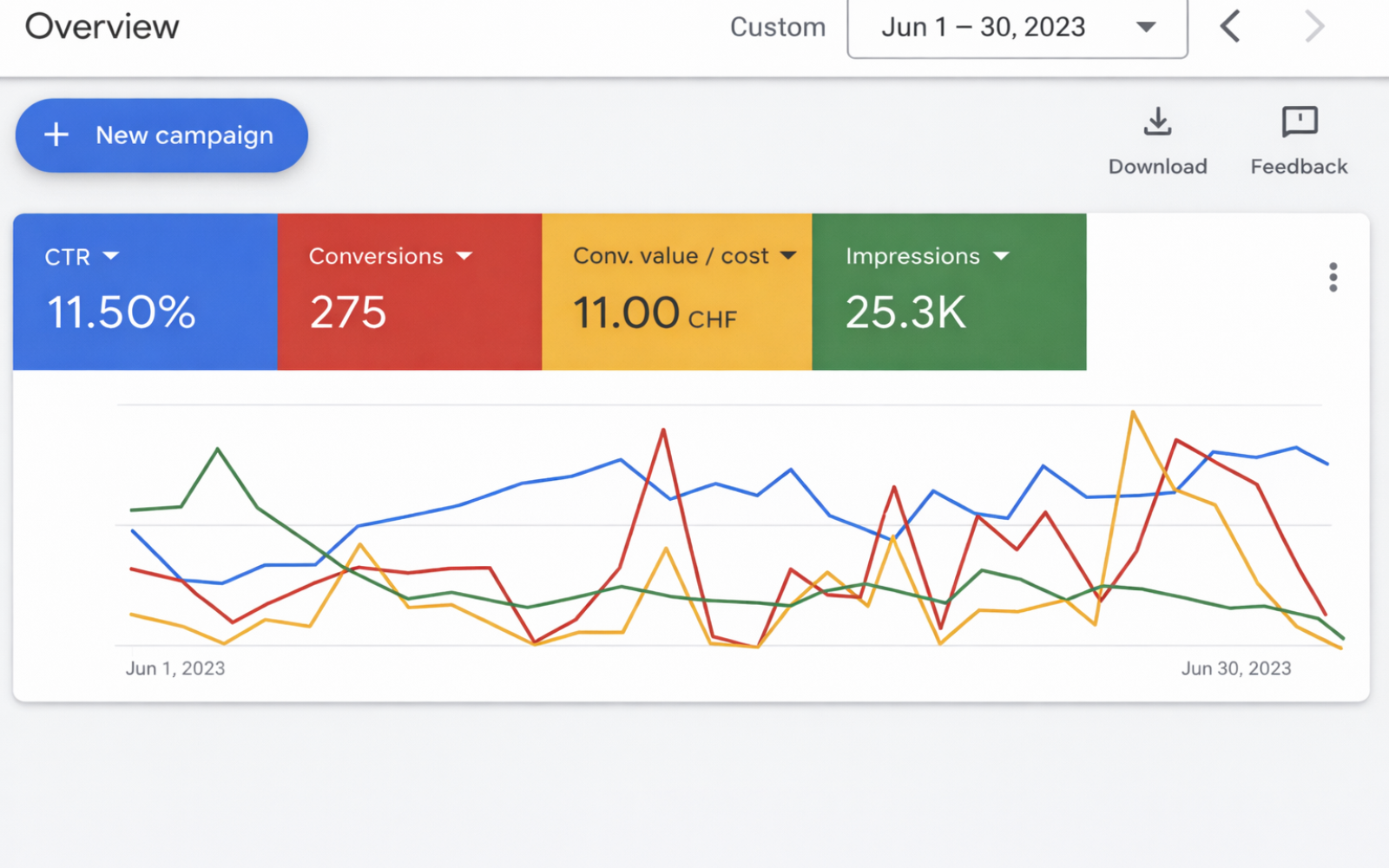 275 appels qualifiés générés en 30 jours à Lausanne pour un coût par lead de 11 CHF. Tracking complet, segmentation par intention et optimisation quotidienne ont transformé Google Search en