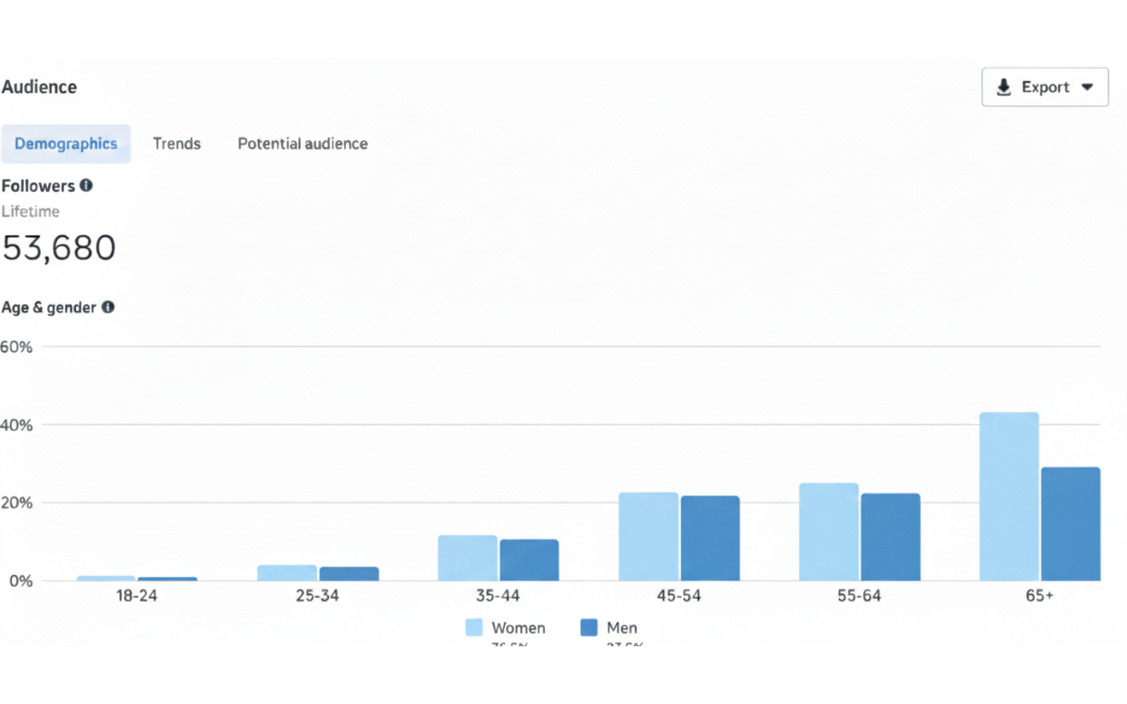 53’680 abonnés acquis en moins de 6 mois via une stratégie organique orientée communauté. Audience majoritairement américaine avec extension UK et Australie, forte concentration 45+ et conversion activée après masse