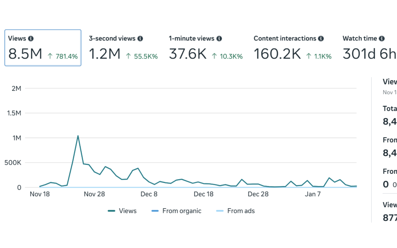 8.5M vues organiques générées sur Meta en 2 mois avec 0€ pub, complétées par 750K vues sur TikTok. Viralisation rapide, partages massifs et engagement élevé ont assuré une croissance explosive.