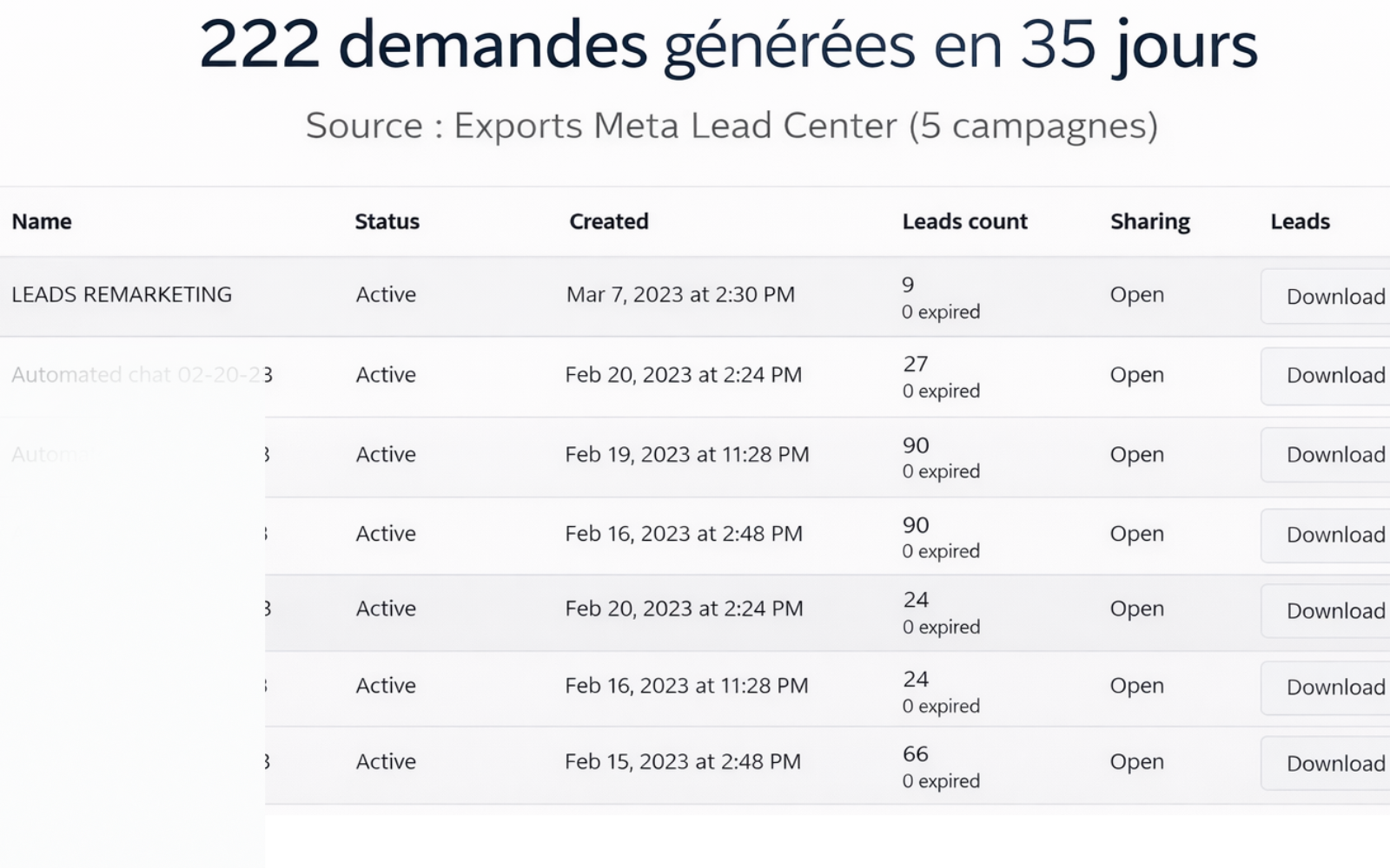 227 demandes générées en 35 jours via un funnel multi-phase orienté conversation (vidéo → retargeting → message → appel). CPL moyen €1.54, avec une phase remarketing descendant jusqu’à €1.17 par