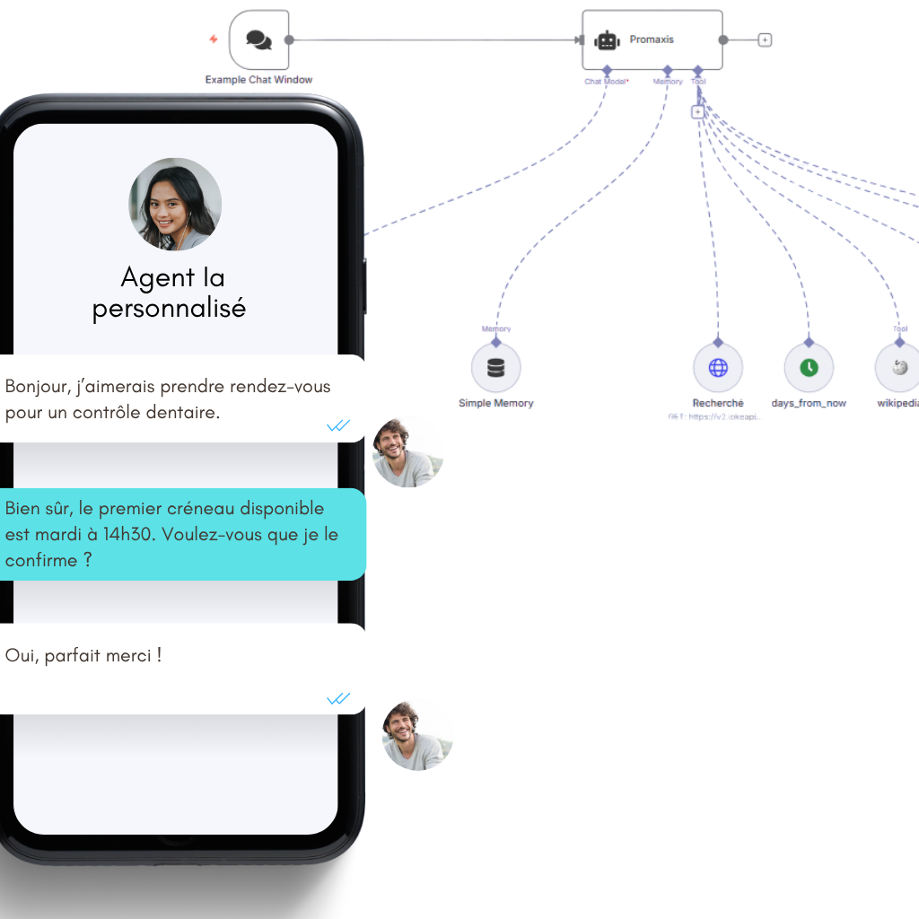 Nos agents IA traitent 80 % des demandes courantes : informations produits, devis, prise de rendez-vous, SAV niveau 1. Ils qualifient les prospects, programment les rendez-vous et mettent à jour le CRM automatiquement. Pour les cas complexes, ils transfèrent intelligemment vers vos équipes avec le contexte complet. Résultat : service client 24h/7, temps de réponse instantané, équipes libérées pour les tâches à forte valeur ajoutée.